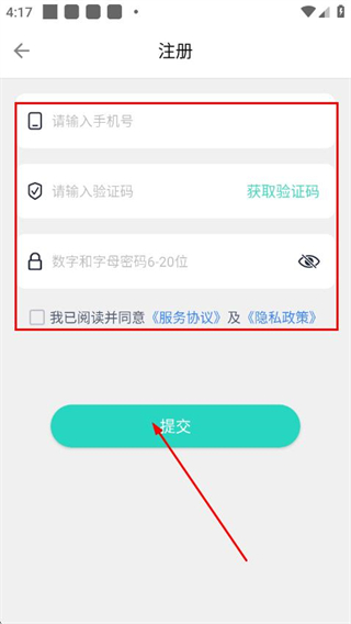 2、填写手机号、获取并输入验证码、设置密码,勾选协议后点击提交。