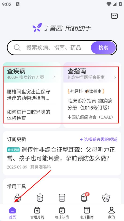 1、打开用药助手APP,在首页查疾病板块,可查看疾病诊疗方案;在查指南板块,能查看各类医学指南。