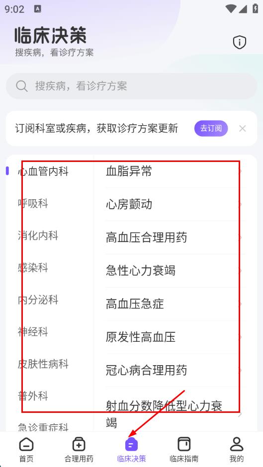 3、点击底部导航栏临床决策,能按科室查找疾病,查看对应疾病的诊疗方案,还能订阅科室或疾病。