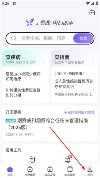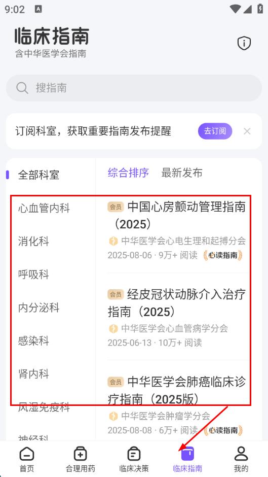 4、点击底部导航栏临床指南,可浏览各科室的临床指南,还能订阅科室,获取重要指南发布提醒。