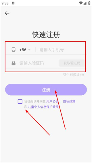 4、勾选协议,输入手机号,获取并输入验证码后,点击注册。