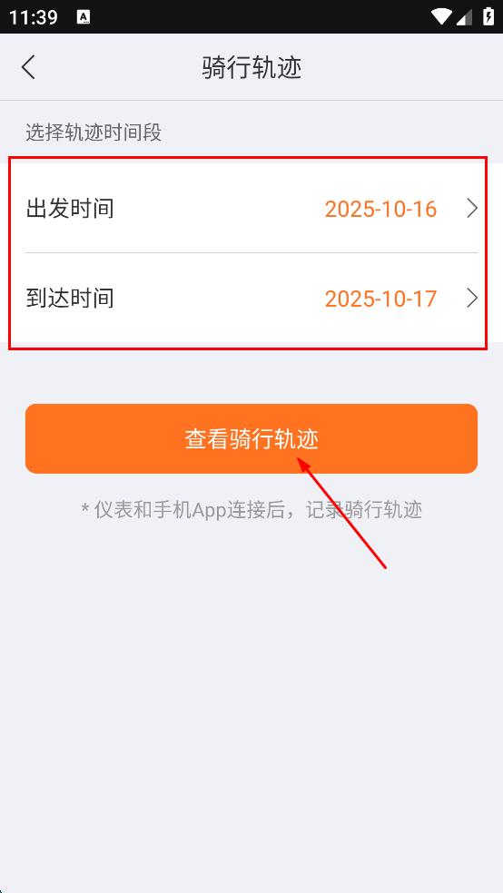 4、在骑行轨迹页面,选择好出发时间和到达时间,然后点击“查看骑行轨迹”按钮,查看对应时间段的骑行轨迹。