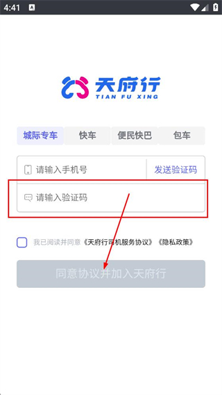 3、在页面中填写收到的请输入验证码,完成天府行司机端的注册/登录操作。