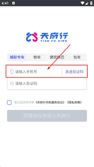 1、在天府行服务协议及隐私政策弹窗中,点击同意,进入注册/登录页面。