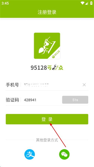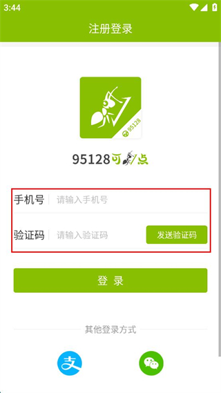 2、进入注册登录页面,输入手机号码,点击发送验证码按钮,输入验证码。