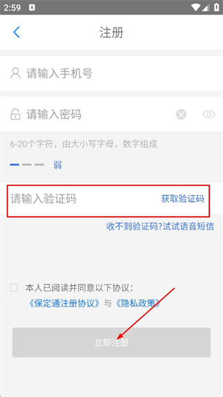 5、点击获取验证码后填写收到的验证码,点击立即注册,完成账号注册操作。