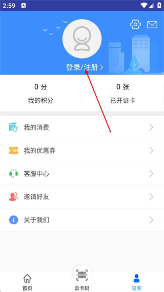 2、在个人中心页面,点击登录/注册,进入登录页面。