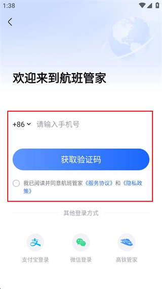 3、在登录界面填写手机号码,勾选同意相关协议后点击获取验证码。