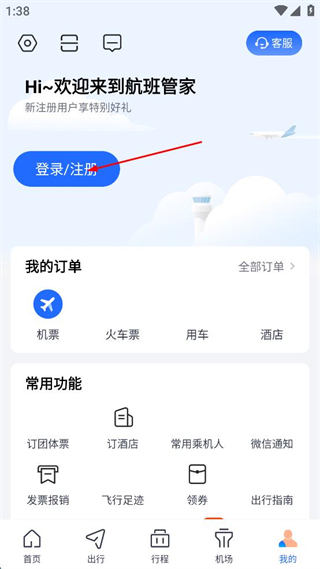 1、打开航班管家应用,点击界面底部的我的选项,进入个人中心页面。