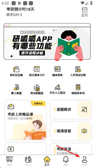 研呱呱是专为考研用户打造的学习软件,提供丰富全科目考研学习资源,用户可随时选择对应科目学习,平台设有在线直播课程,支持与老师一对一教学互动,助力用户精准攻克难点、巩固知识,轻松提升考研成绩,顺利上岸。