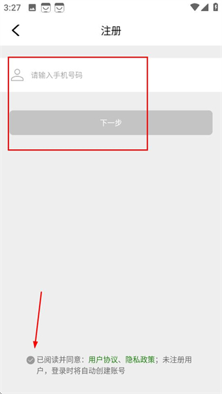 3、在注册页面,填写手机号并勾选协议后,点击下一步完成注册流程。
