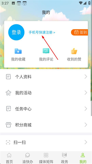 2、在个人中心页面,点击手机号快速注册选项,进入注册页面。