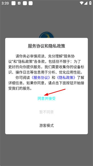 1、打开软件在服务协议和隐私政策弹窗中,点击同意并接受按钮,进入登录页面。