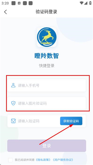 2、在瞪羚数智的验证码登录页面,填写手机号和图片验证码后,点击获取验证码。