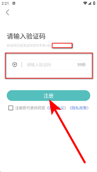 4、在验证码输入页,输入验证码,勾选协议后,点击注册,完成注册。