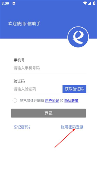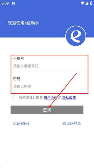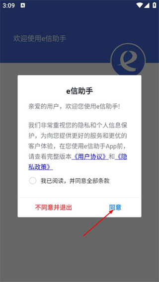1、在e信助手的用户协议弹窗中,点击同意,进入登录页面。