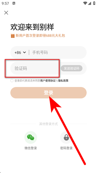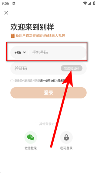 3、在欢迎来到别样页面,输入手机号码,点击发送验证码。