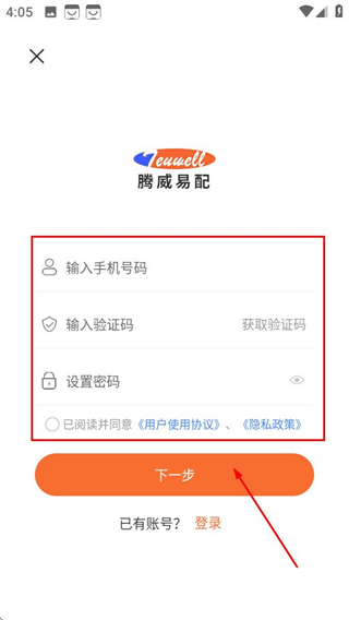1、在腾威易配的登录页面,点击创建账号选项,进入注册页面。