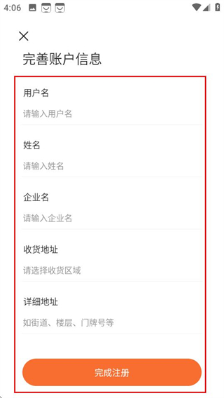 3、在完善账户信息页面,填写相关信息后点击完成注册,完成账号注册。