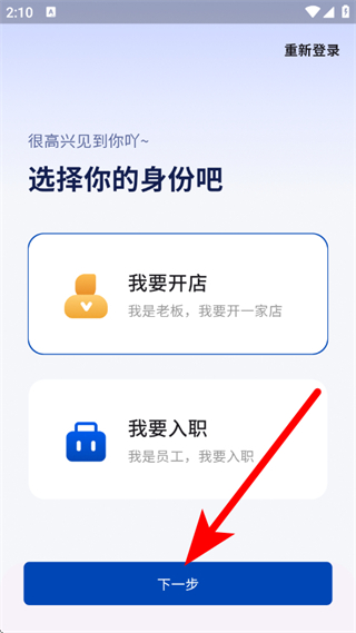 3、在身份选择页面,点击选择我要开店,点击下一步。