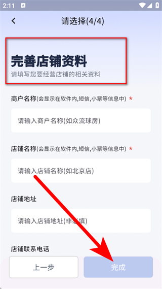 4、进入完善店铺资料页面,信息填写完成后,点击完成,提交店铺资料,完成开店流程。