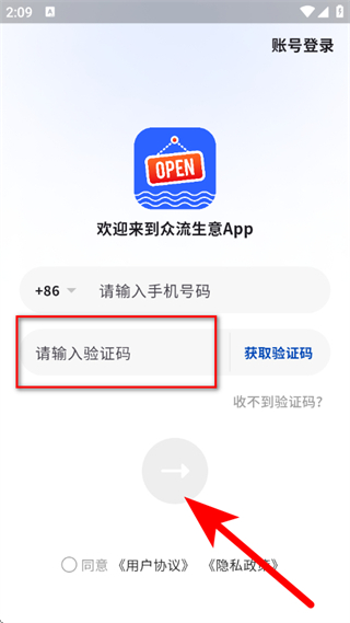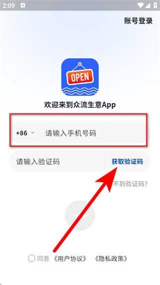 1、打开众流生意,在账号登录页面,输入手机号码,点击获取验证码。