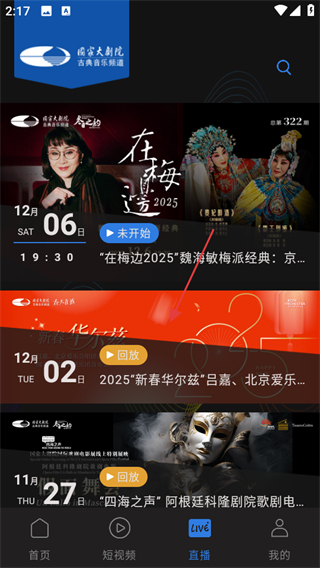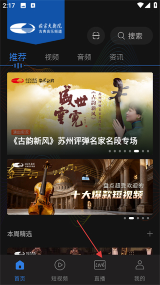 1、在大剧院古典首页,点击底部的直播选项,进入直播页面。