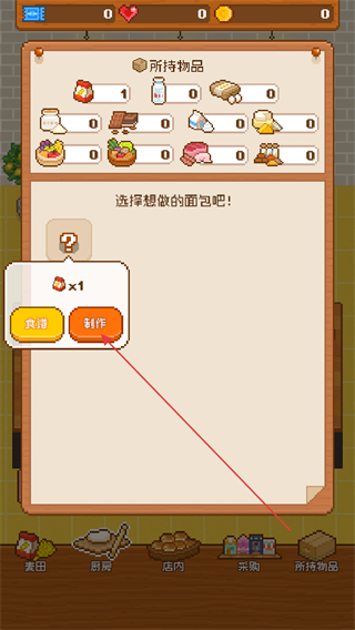 2、进入界面后可查看所持物品在选择想做的面包吧区域点击制作按钮启动面包制作。