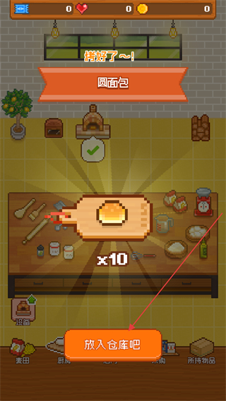 4、当前圆面包已烤好数量为×10点击界面中的放入仓库吧按钮即可将该面包存入库房。