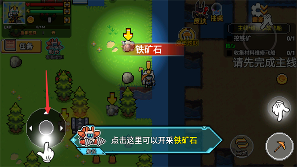 1、用左下角摇杆操控角色移动、靠近矿石处、准备完成挖铁矿的主线任务、推进荒岛求生的游戏进程。