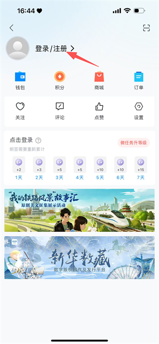 2、在个人页面,点击登录/注册选项,进入登录方式选择界面。