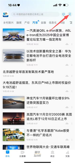 1、在新华网资讯页面,点击右上角的个人中心入口,进入个人页面。