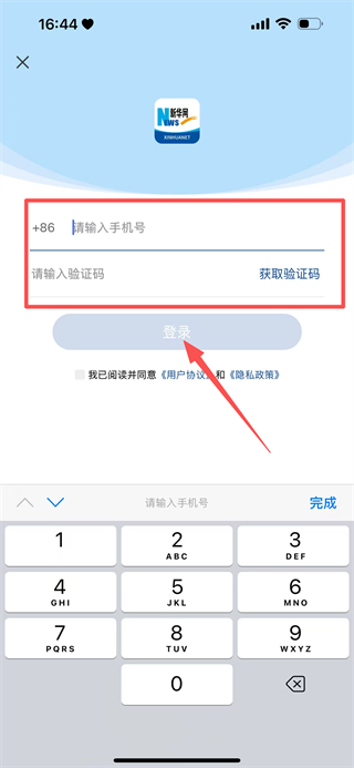 4、在登录页面,填写手机号,点击获取验证码后填写对应验证码,点击登录,完成账号登录。