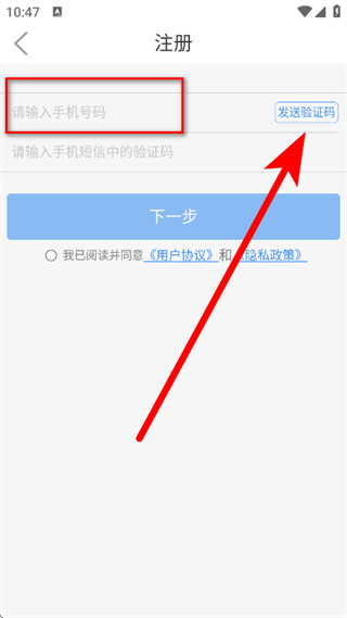 4、输入手机短信中的验证码,勾选协议后,点击下一步,完成注册流程。