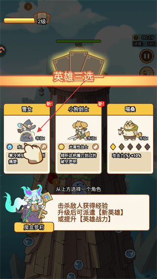 1、在英雄三选一界面选喵桑,派遣该英雄加入战斗,推进14级关卡。
