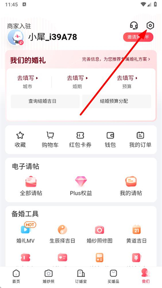 1、打开婚礼纪app,在我们页面点击右上角设置图标。