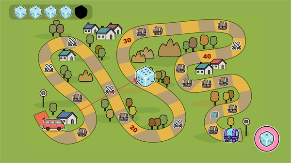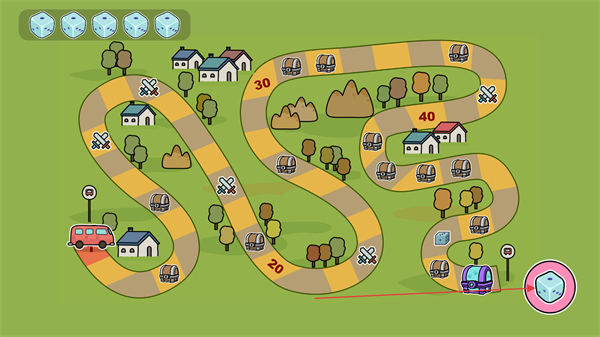 2、进入冒险地图,红色小车沿路线移动,目标是紫色终点。