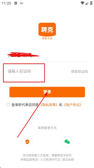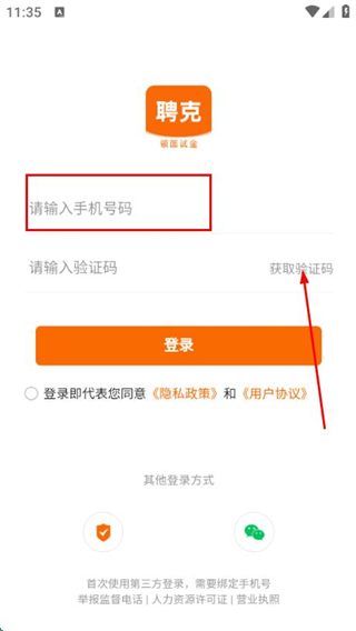 2、在登录页面填写手机号,勾选协议后,点击获取验证码。