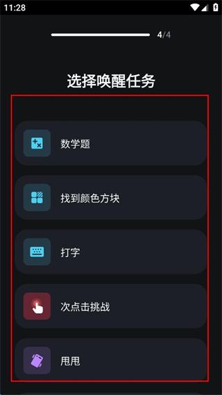 4、进入选择唤醒任务页面,选定对应的唤醒任务类型,完成闹钟配置。