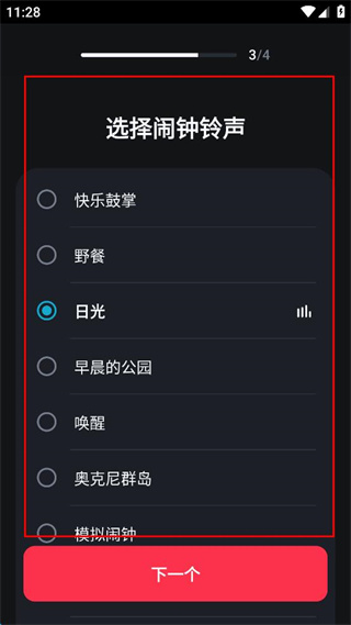 3、在选择闹钟铃声页面,挑选喜欢的铃声选项,再点击下一个按钮。