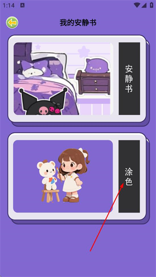 2、在我的安静书页面,点击涂色选项,进入选择上色页面。