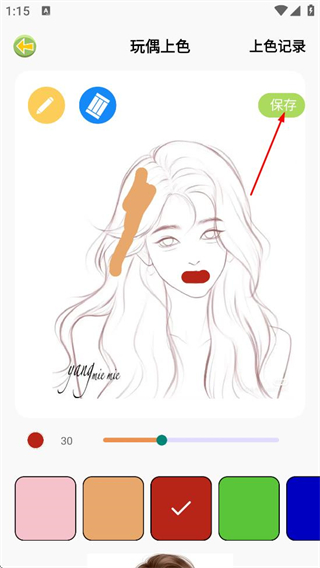 4、选择喜欢的颜色完成涂色后,点击右上角的保存,完成本次涂色操作。