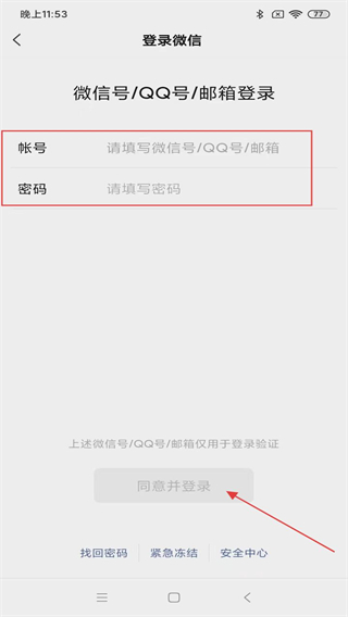 5、在该页面内,输入要登录的微信号、密码,再点击同意并登录的按钮即可。