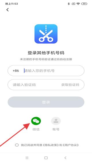 4、在手机号码登录的页面内,点击下方微信的按钮。