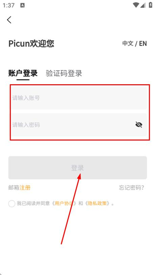 3、在登录页面填写账号和密码,勾选协议后,点击登录完成账号登录操作。