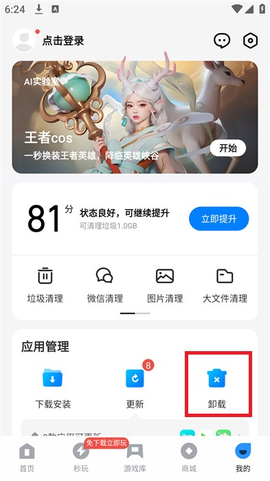 2、在个人主页界面之中,我们可以看到下方会有一个【卸载】功能,点击进入到其中;
