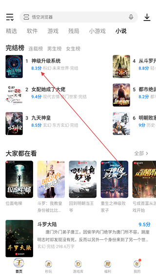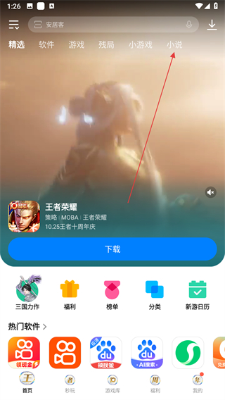 1、打开应用宝,点击上方小说选项,进入小说板块。