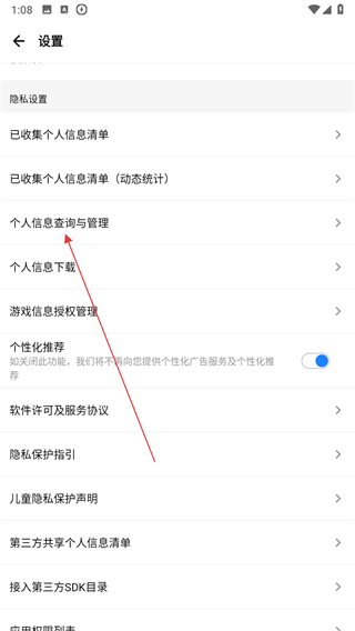 2、在设置界面里,找到个人信息查询与管理选项并点击。