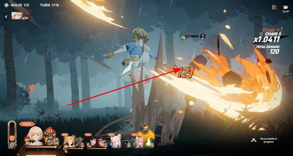 2、进入战斗场景,观察敌方状态,控制角色释放攻击技能,技能命中敌方会显示伤害数值,累计伤害达成目标可推进战斗。