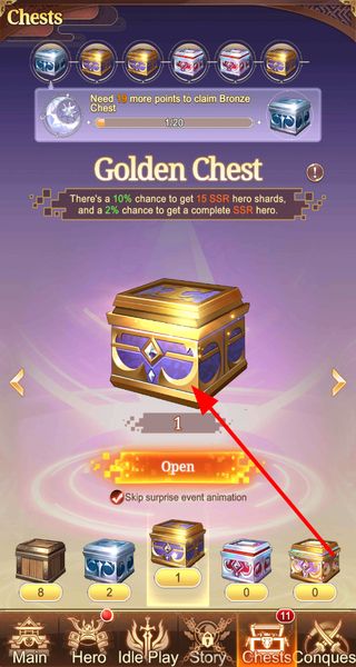 3、宝箱招募可查看不同宝箱的获取条件,点击开启黄金宝箱,有概率获得完整SSR英雄,同时可切换不同类型的宝箱。